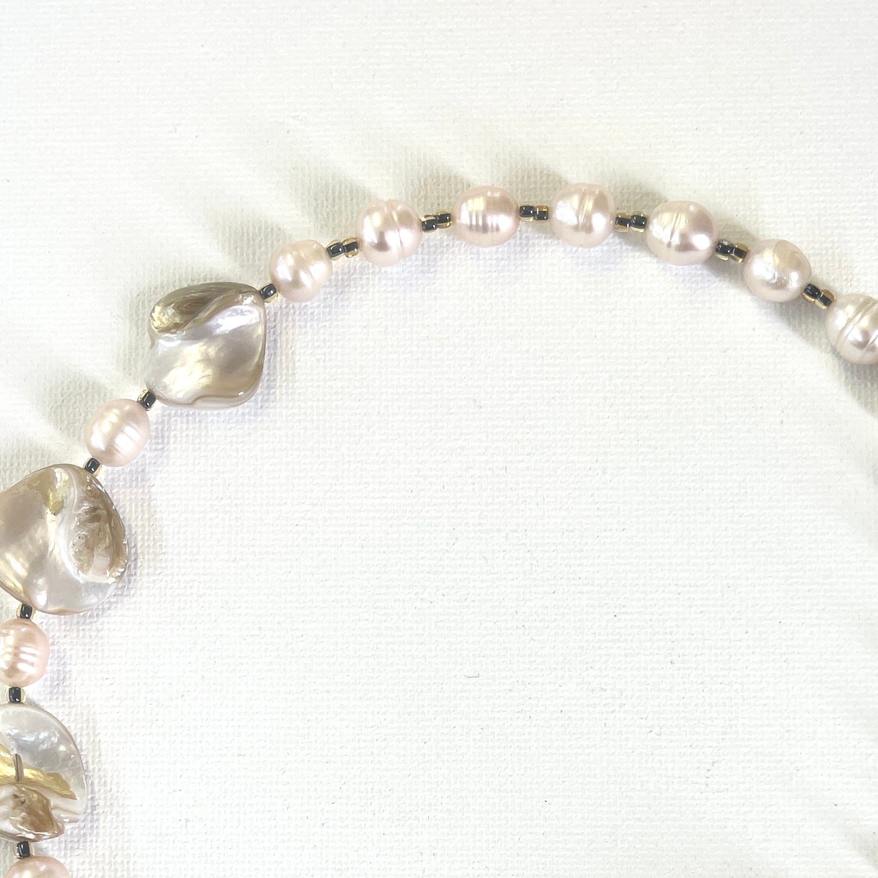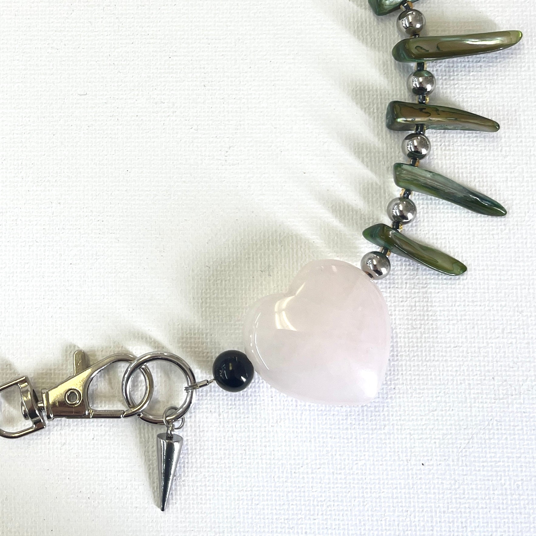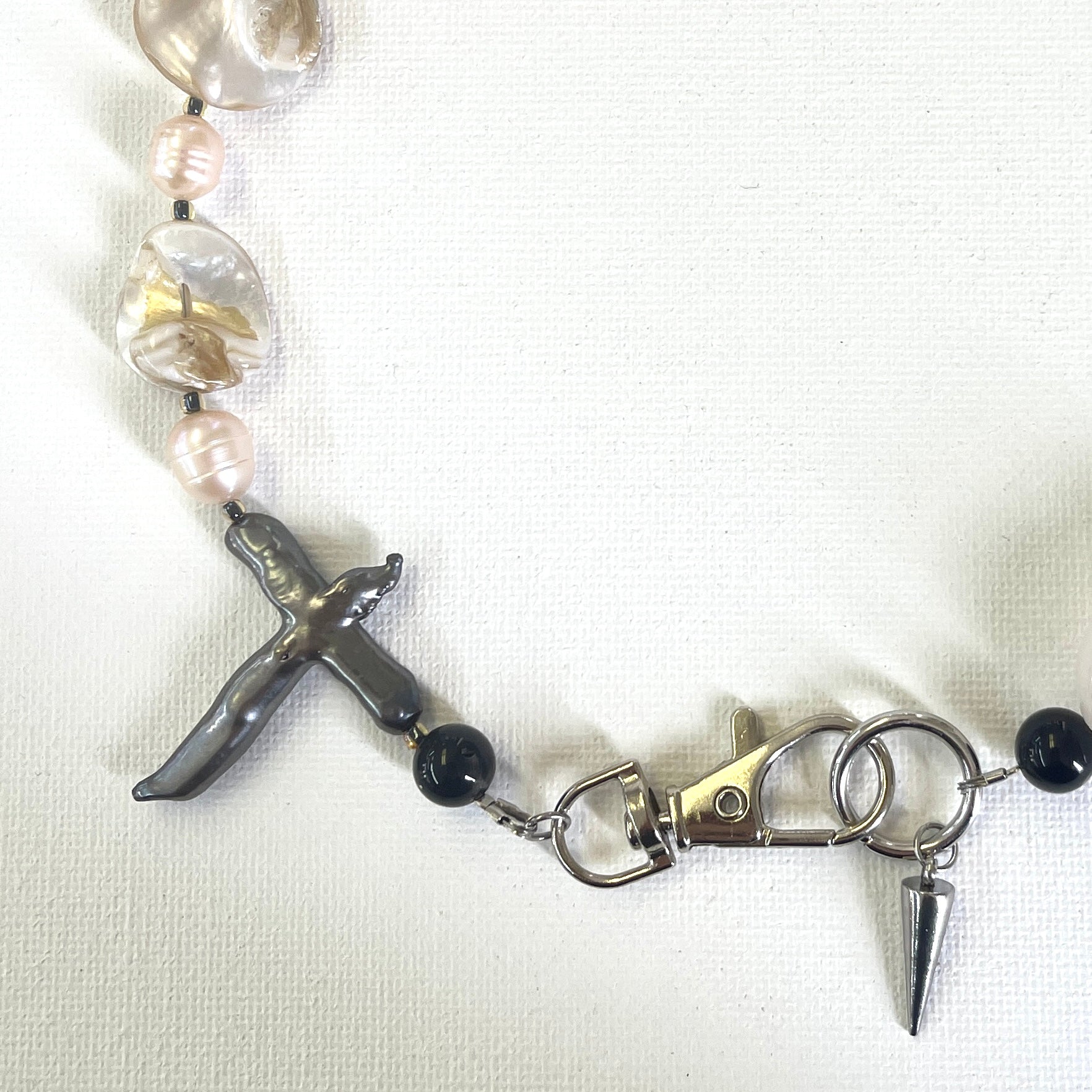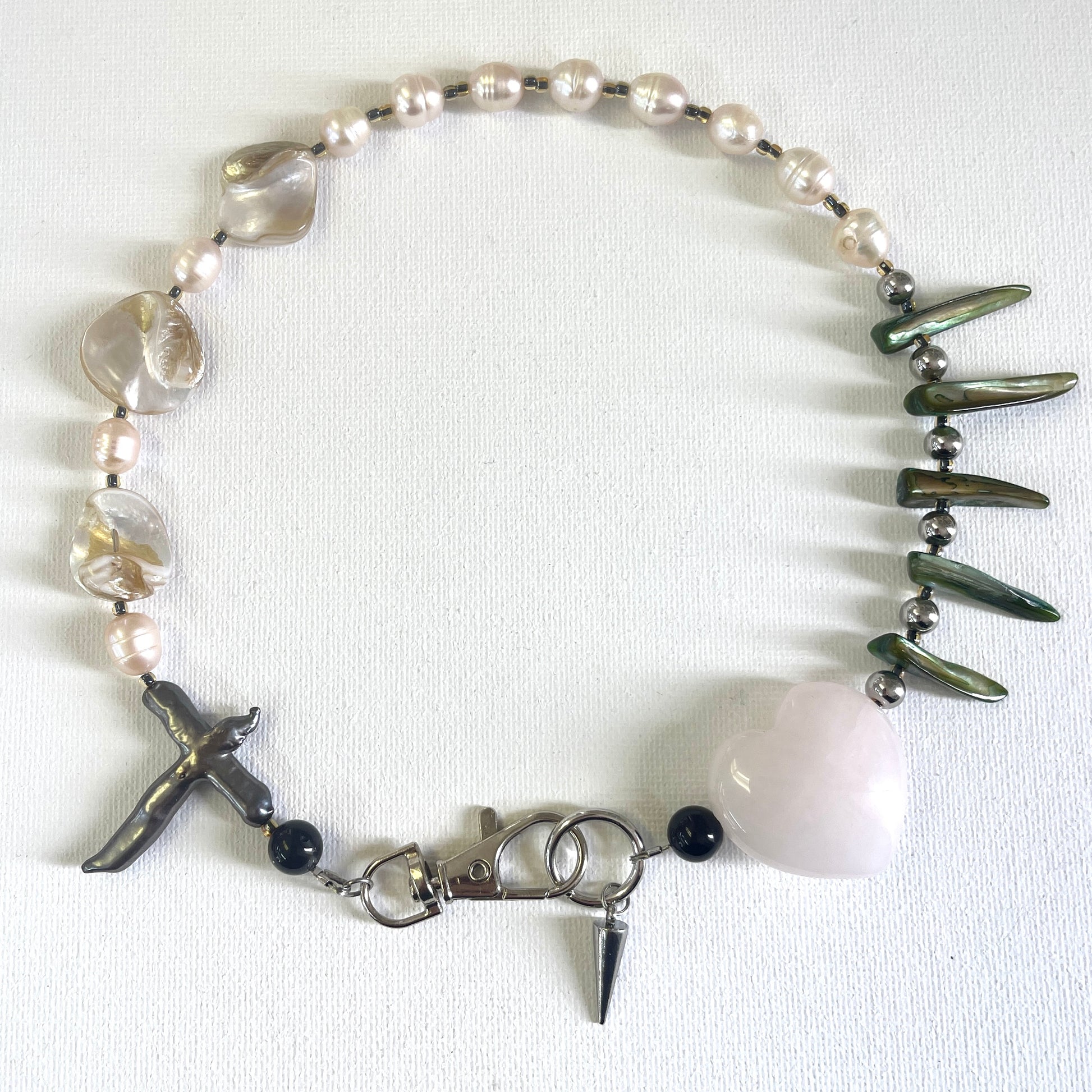 Handcrafted from freshwater pearls and natural shells, highlighted by a polished rose quartz heart and a distinctive freshwater pearl cross accent. Finished with stainless steel findings.