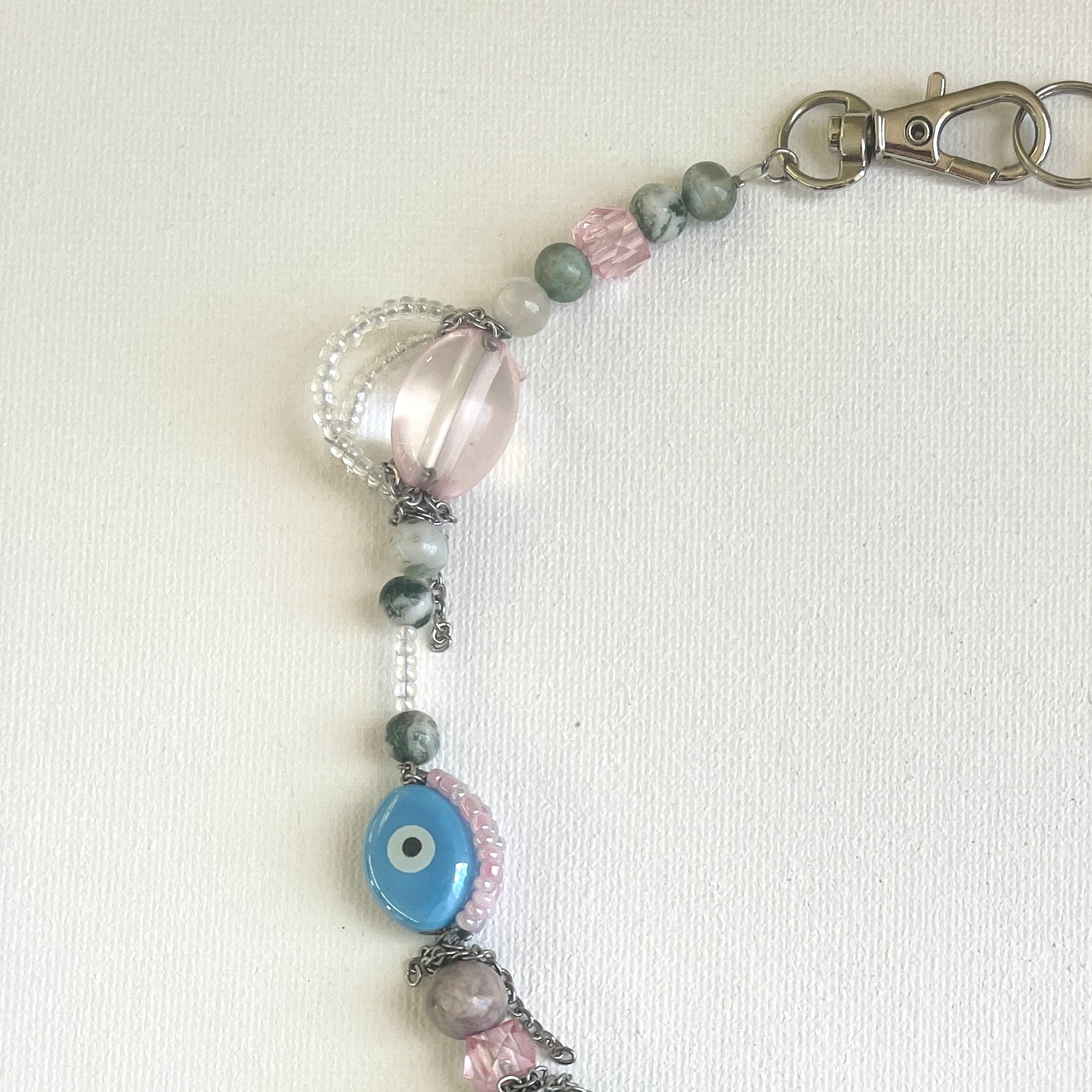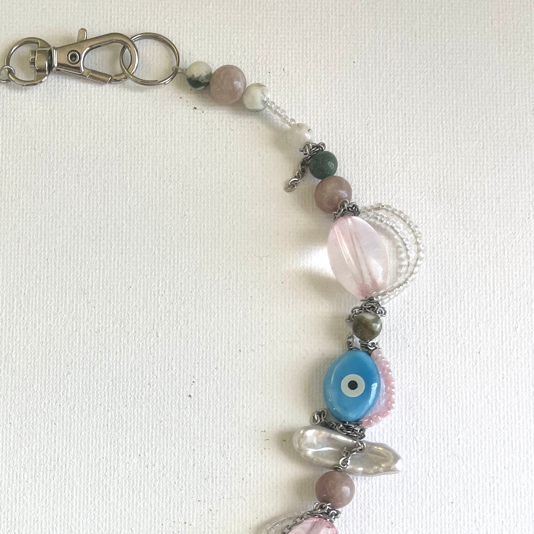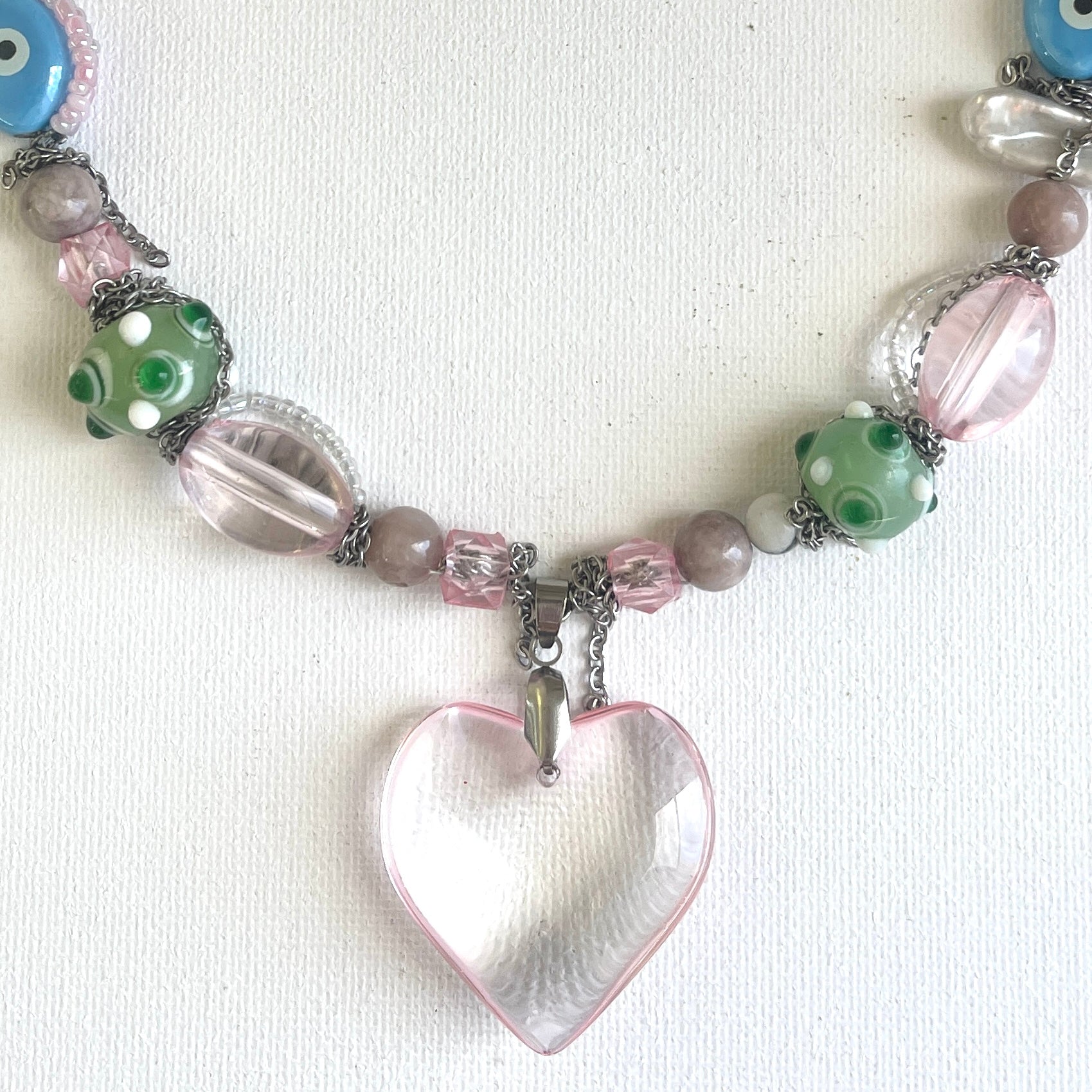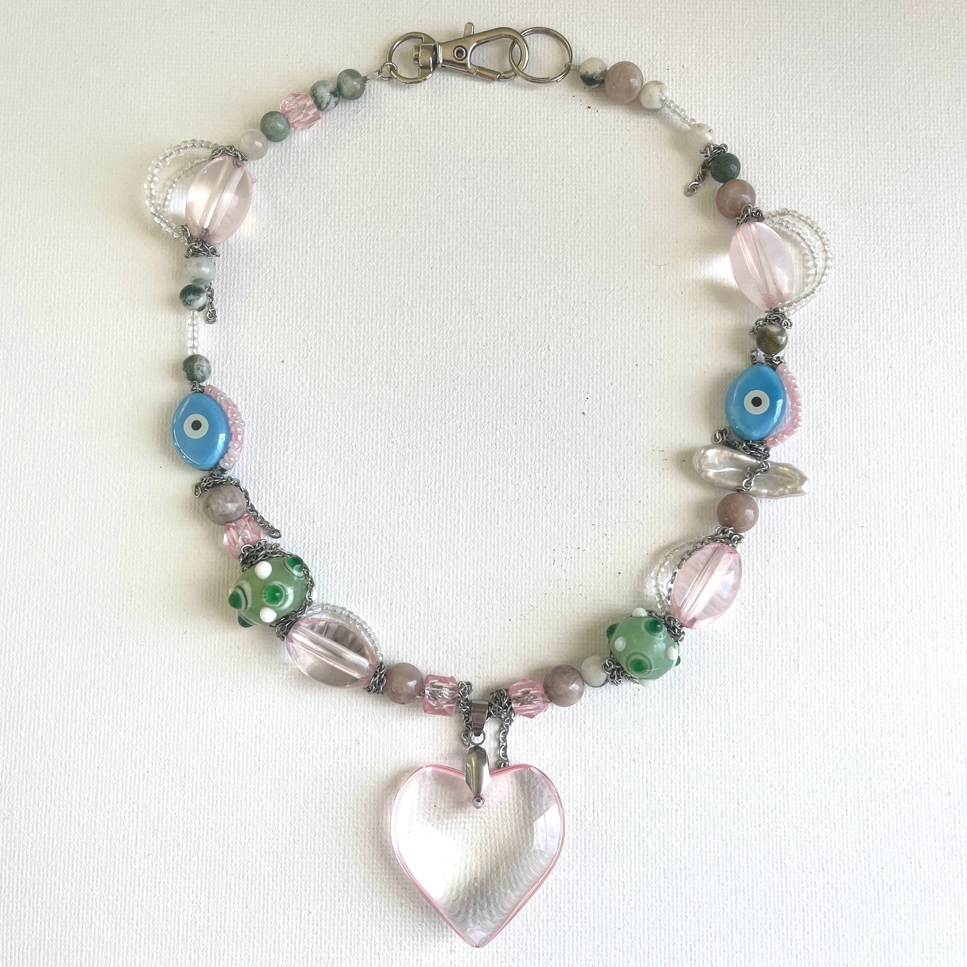 Handcrafted from a mix of glass beads, amethyst, and ceramic accents, highlighted by a luminous freshwater pearl and a polished glass heart pendant. Finished with stainless steel findings.