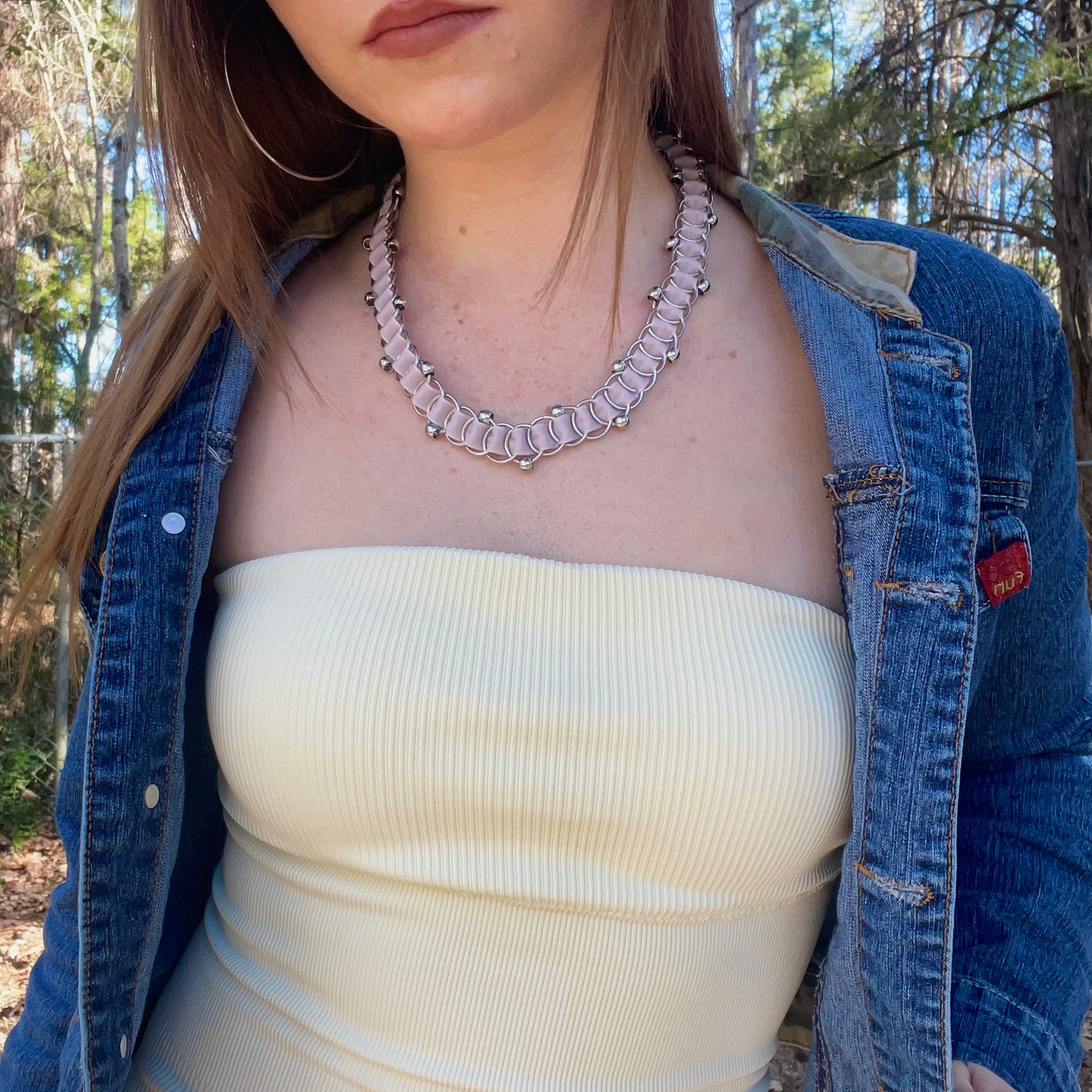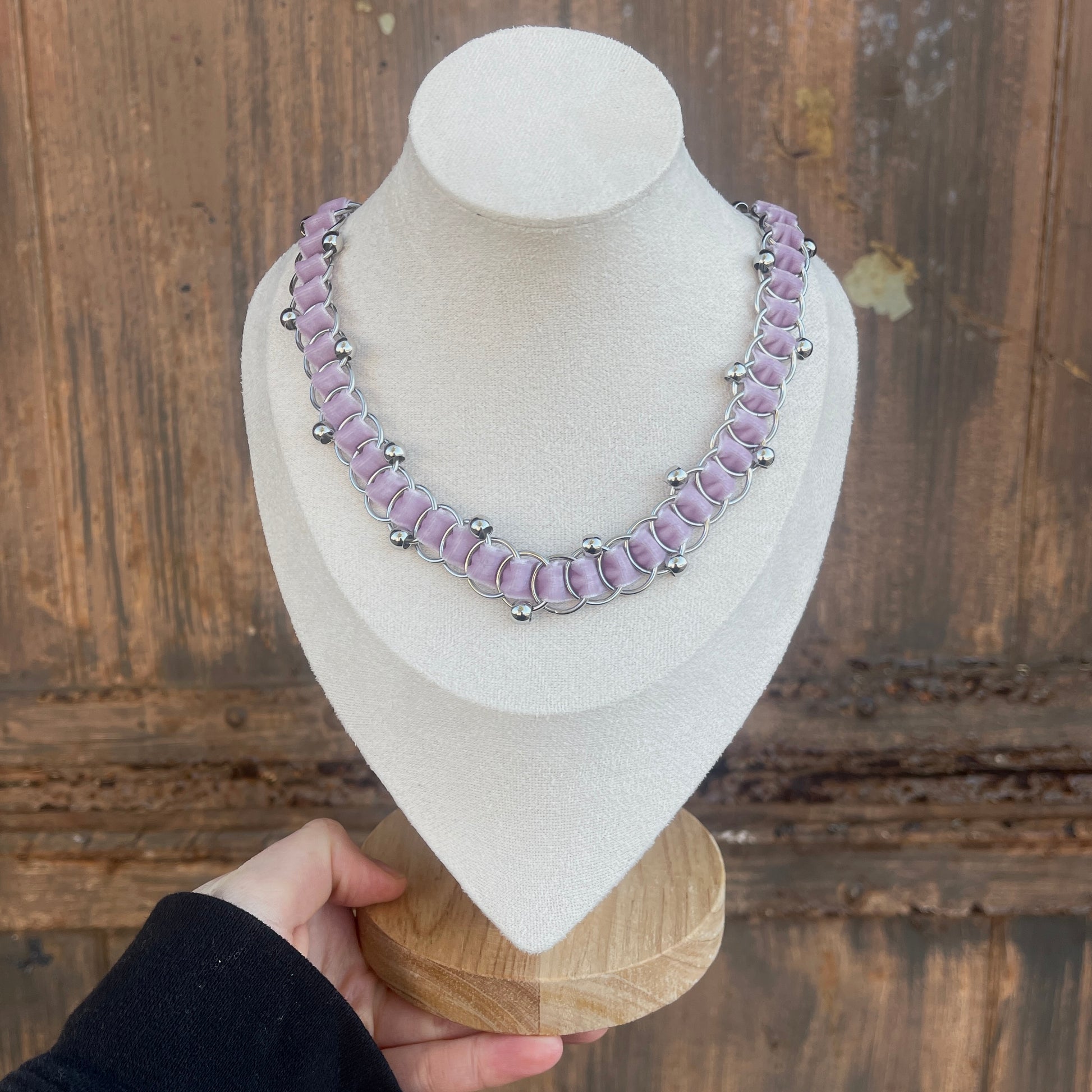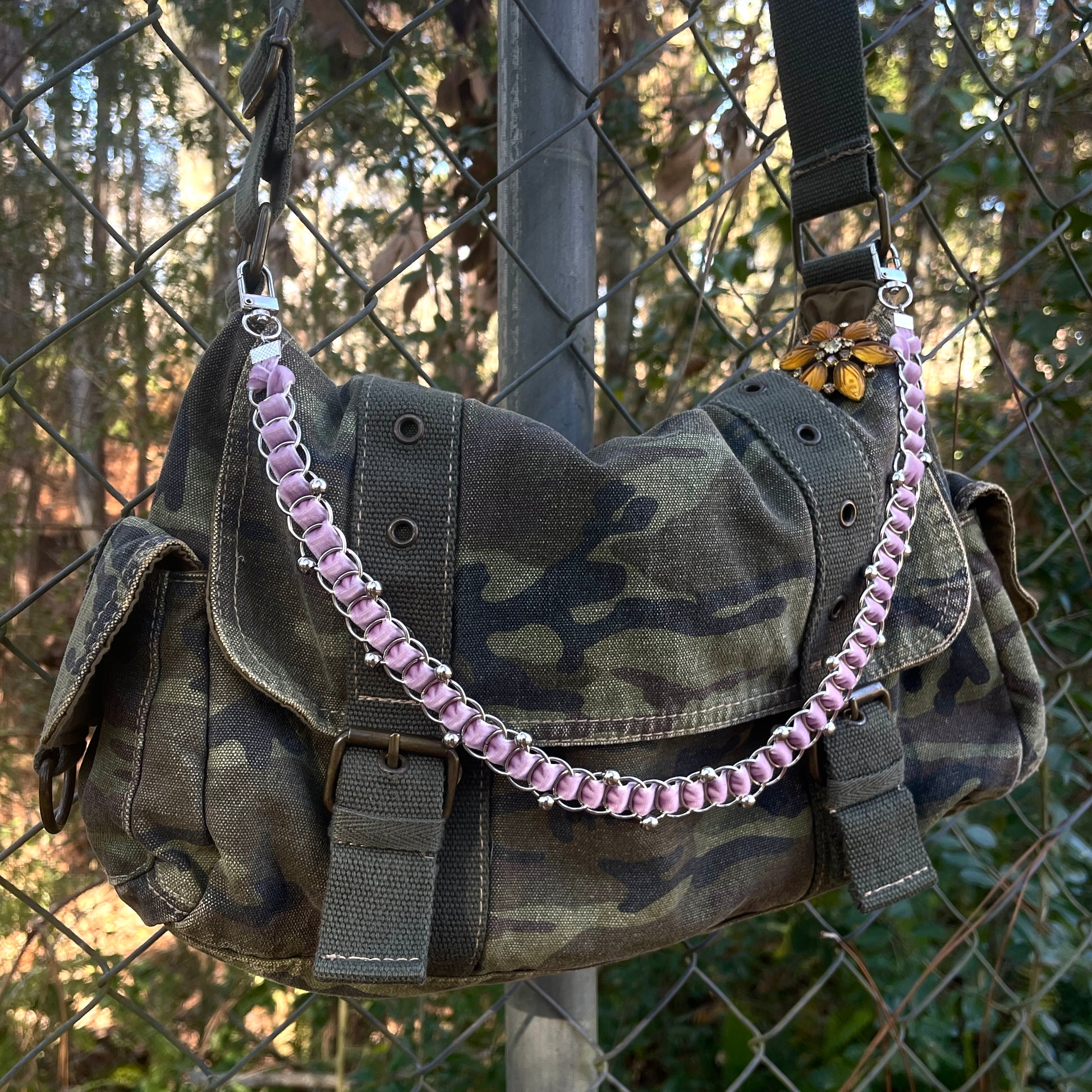 Handcrafted purse chain or necklace with velvet ribbon, finished with stainless steel findings.
